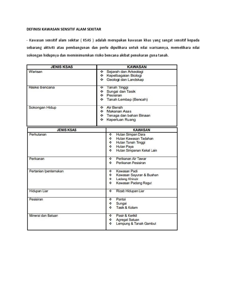 Kawasan sensitif alam sekitar ( ksas ) adalah merupakan kawasan khas yang sangat sensitif kepada sebarang aktiviti atau pembangunan dan perlu dipulihara untuk nilai warisannya, memelihara nilai sokongan hidupnya dan meminimumkan risiko bencana akibat penukaran guna tanah. Kriteria bagi menentukan kawasan sensitif alam sekitar dalam pembangunan kawasan pelancongan di pulau langkawi abstrak pelancongan merupakan aktiviti yang semakin popular. Terhadap alam sekitar dan yang terletak di kawasan sensitif alam sekitar 3. Atau kawasan sensitif alam sekitar. Gpp kawasan tadahan air dan sumber air tanah.